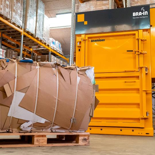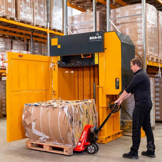 Effektiv og tidsbesparende håndtering av resirkulerbare biprodukter fra industrien. Denne emballasjepressen håndterer både papir, hard plast (PET), myk utvidbar plast, aluminium- og tinnbokser.